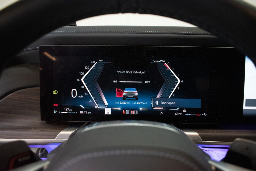 This 7 Series is well equipped with Connected Package Pro, M Sport Package Pro, M Sport Professional Package (Extended Shadowline Trim, M Sport Brakes w/Black Calipers, M Sport Pro Contents, and Rear Spoiler), Navigation system: BMW Maps Navigation, 18 Speakers, 4-Wheel Disc Brakes, ABS brakes, Active Driving Assistant Pro, Adaptive suspension, Air Conditioning, Alloy wheels, AM/FM radio: SiriusXM, Anti-whiplash front head restraints, Apple CarPlay & Android Auto Compatibility, Auto High-beam Headlights, Auto tilt-away steering wheel, Auto-dimming door mirrors, Auto-dimming Rear-View mirror, Auto-leveling suspension, Automatic Doors (DISC), Automatic temperature control, BMW TeleServices, Bowers & Wilkins Surround Sound, Brake assist, Bumpers: body-color, ConnectedDrive Services, Coordinated Upholstery Color Alcantara Headliner, Crystal Headlights, Delay-off headlights, Door auto-latch, Driver door bin, Driver vanity mirror, Dual front impact airbags, Dual front side impact airbags, Electronic Stability Control, Emergency communication system: BMW Assist eCall, Enhanced USB & Bluetooth, Extended Merino Leather Upholstery, Exterior Parking Camera Rear, Fineline Open Pore Wood Trim w/Piano Black Accents, Four wheel independent suspension, Front anti-roll bar, Front Bucket Seats, Front Center Armrest, Front dual zone A/C, Front Massaging Seats, Front reading lights, Front Ventilated Seats, Fully automatic headlights, Garage door transmitter, Genuine wood dashboard insert, Head restraints memory, Heads-Up Display, Heated door mirrors, Heated front seats, Heated rear seats, Heated steering wheel, Highway Assistant, Illuminated entry, Increased Top Speed Limiter, Leather steering wheel, Live Cockpit Pro w/Navi, Low tire pressure warning, Memory seat, Multi-Functional Seats, Natural Interaction, Occupant sensing airbag, Outside temperature display, Overhead airbag, Overhead console, Panic alarm, Parking Assistant Professional, Passenger door bin, Passenger vanity mirror, Personal eSIM 5G, Power adjustable front head restraints, Power door mirrors, Power driver seat, Power passenger seat, Power steering, Power windows, Radio data system, Radio: Audio System, Rain sensing wipers, Rear air conditioning, Rear anti-roll bar, Rear audio controls, Rear dual zone A/C, Rear reading lights, Rear seat center armrest, Rear Window Blind, Rear window defroster, Remote keyless entry, Security system, SiriusXM Satellite Radio, Speed control, Speed-sensing steering, Speed-Sensitive Wipers, Sport steering wheel, Steering wheel memory, Steering wheel mounted audio controls, Surround View w/3D View, Tachometer, Telescoping steering wheel, Tilt steering wheel, Traction control, Trip computer, Variably intermittent wipers, Ventilated front seats, Weather band radio, Wheels: 20" M Aerodynamic Bi-Color Style 907, and Wheels: 21" M Aerodynamic Bi-Color Style 908.