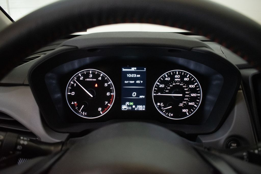 This Crosstrek is well equipped with Standard Model, 4-Wheel Disc Brakes, 6 Speakers, ABS brakes, Air Conditioning, Alloy wheels, AM/FM radio: SiriusXM with 360L, Anti-whiplash front head restraints, Auto High-beam Headlights, Auto-Dimming Mirror with Compass and HomeLink, Automatic temperature control, Brake assist, Bumpers: body-color, Cargo Net, Driver door bin, Driver vanity mirror, Dual front impact airbags, Dual front side impact airbags, Electronic Stability Control, Emergency communication system: MySubaru Companion (5-years free), Exterior Parking Camera Rear, Four wheel independent suspension, Front anti-roll bar, Front Bucket Seats, Front Center Armrest, Front dual zone A/C, Front fog lights, Front reading lights, Fully automatic headlights, Heated door mirrors, Heated Front Bucket Seats, Heated front seats, Heated steering wheel, Illuminated entry, Knee airbag, Leather Shift Knob, Leather steering wheel, Leather-Trimmed Upholstery, LED Upgrade, Low tire pressure warning, Occupant sensing airbag, Outside temperature display, Overhead airbag, Overhead console, Panic alarm, Passenger door bin, Passenger vanity mirror, Power door mirrors, Power driver seat, Power steering, Power windows, Radio data system, Radio: Subaru 11.6" Multimedia Plus System, Rear anti-roll bar, Rear seat center armrest, Rear side impact airbag, Rear window defroster, Rear window wiper, Remote keyless entry, Security system, Speed control, Speed-sensing steering, Splash Guards, Split folding rear seat, Spoiler, Steering wheel mounted audio controls, Tachometer, Telescoping steering wheel, Tilt steering wheel, Traction control, Trip computer, Turn signal indicator mirrors, USB Charging Cable Set, Variably intermittent wipers, and Wheels: 18" x 7.0" J Machine Finish Aluminum-Alloy.