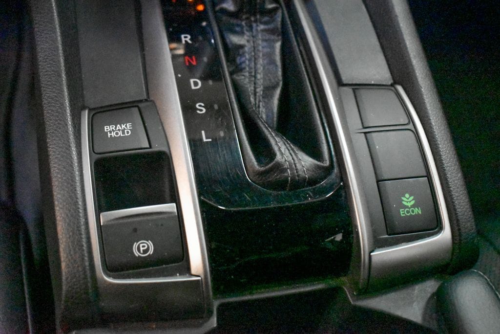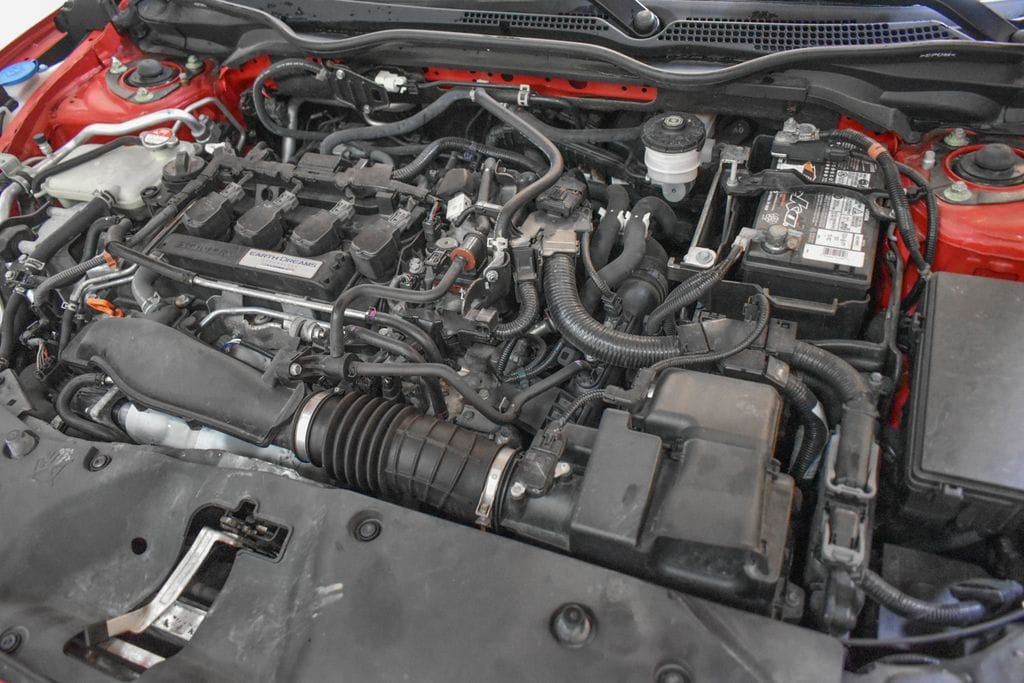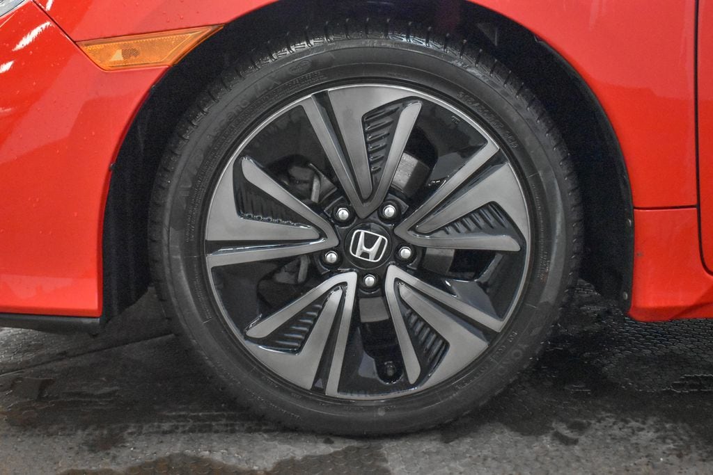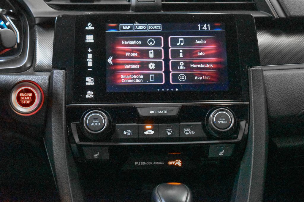 This Civic is well equipped with Navigation System, 17" Alloy Wheels, 4-Wheel Disc Brakes, 8 Speakers, ABS brakes, Air Conditioning, Alloy wheels, AM/FM radio: SiriusXM, Apple CarPlay/Android Auto, Auto High-beam Headlights, Auto-dimming Rear-View mirror, Automatic temperature control, Brake assist, Bumpers: body-color, Compass, Delay-off headlights, Driver door bin, Driver vanity mirror, Dual front impact airbags, Dual front side impact airbags, Electronic Stability Control, Emergency communication system: HondaLink, Exterior Parking Camera Rear, Four wheel independent suspension, Front anti-roll bar, Front Bucket Seats, Front Center Armrest, Front dual zone A/C, Front fog lights, Front reading lights, Fully automatic headlights, Heated door mirrors, Heated front seats, Illuminated entry, Leather Shift Knob, Leather-Trimmed Seating Surfaces, Low tire pressure warning, Occupant sensing airbag, Outside temperature display, Overhead airbag, Panic alarm, Passenger door bin, Passenger vanity mirror, Power door mirrors, Power driver seat, Power moonroof, Power steering, Power windows, Radio data system, Radio: 180-Watt AM/FM/HD/SiriusXM Audio System, Rear anti-roll bar, Rear seat center armrest, Rear window defroster, Rear window wiper, Reclining Heated Front Bucket Seats, Remote keyless entry, Security system, Speed control, Speed-sensing steering, Split folding rear seat, Spoiler, Steering wheel mounted audio controls, Tachometer, Telescoping steering wheel, Tilt steering wheel, Traction control, Trip computer, and Variably intermittent wipers.