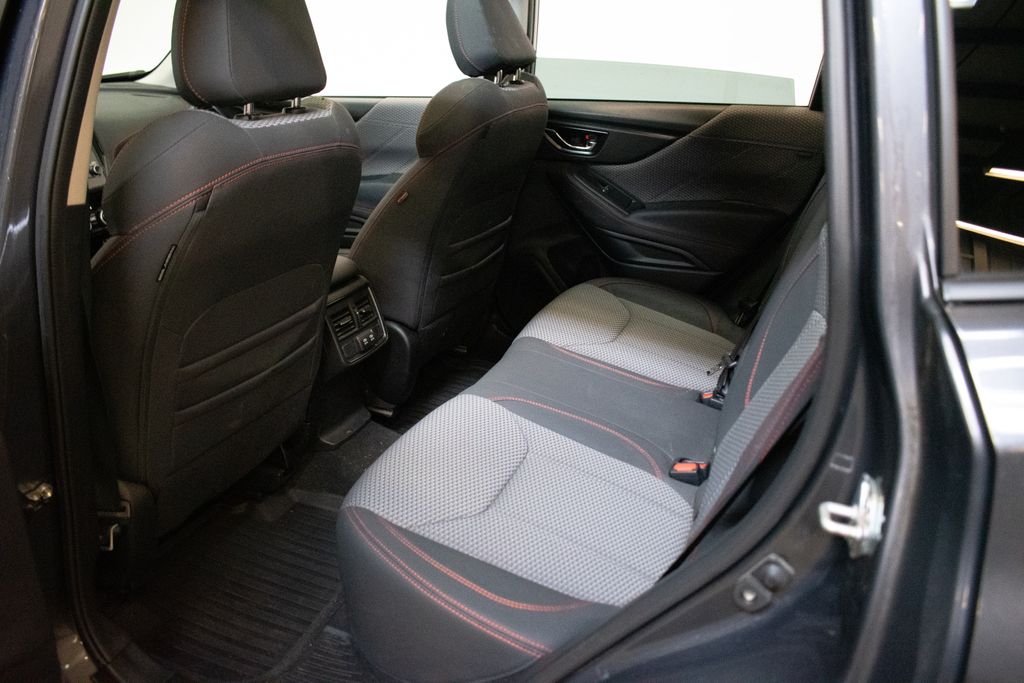 This Forester is well equipped with Standard Model, 3.70 Axle Ratio, 4-Wheel Disc Brakes, 6 Speakers, ABS brakes, Air Conditioning, Alloy wheels, AM/FM radio: SiriusXM, Anti-whiplash front head restraints, Auto High-beam Headlights, Auto-Dimming Exterior Mirror w/Approach Light, Auto-Dimming Mirror w/Compass & HomeLink, Automatic temperature control, Brake assist, Bumpers: body-color, Cargo Net, CD player, Driver door bin, Driver vanity mirror, Dual front impact airbags, Dual front side impact airbags, Electronic Stability Control, Emergency communication system: STARLINK Safety and Security (Subscription Required), Exterior Parking Camera Rear, Four wheel independent suspension, Front anti-roll bar, Front Bucket Seats, Front Center Armrest, Front fog lights, Front reading lights, Fully automatic headlights, Heated door mirrors, Heated Front Bucket Seats, Heated front seats, Illuminated entry, Knee airbag, Leather Shift Knob, Low tire pressure warning, Occupant sensing airbag, Outside temperature display, Overhead airbag, Overhead console, Panic alarm, Passenger door bin, Passenger vanity mirror, Power door mirrors, Power driver seat, Power moonroof: Panoramic, Power steering, Power windows, Radio data system, Radio: Subaru Starlink 6.5" Multimedia Plus System, Rear anti-roll bar, Rear Bumper Cover, Rear seat center armrest, Rear Seatback Protector, Rear window defroster, Rear window wiper, Remote keyless entry, Roof rack: rails only, Security system, Speed control, Speed-sensing steering, Splash Guards, Split folding rear seat, Spoiler, Sport Cloth Upholstery, STARLINK/Apple CarPlay/Android Auto, Steering wheel mounted audio controls, Tachometer, Telescoping steering wheel, Tilt steering wheel, Traction control, Trip computer, Turn signal indicator mirrors, Variably intermittent wipers, and Wheels: 18" x 7.0 J Black Finish Aluminum-Alloy.